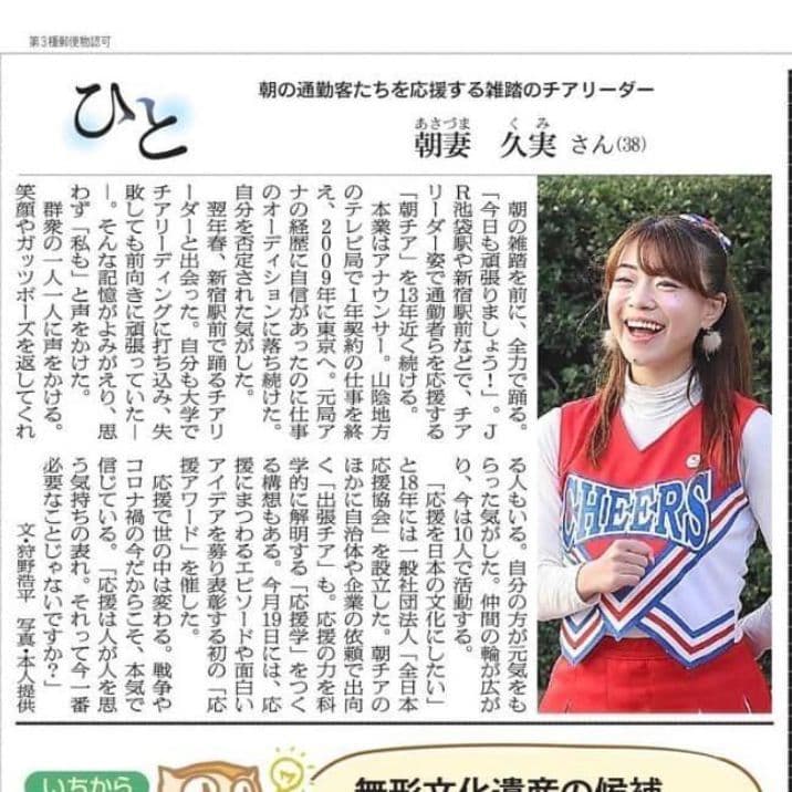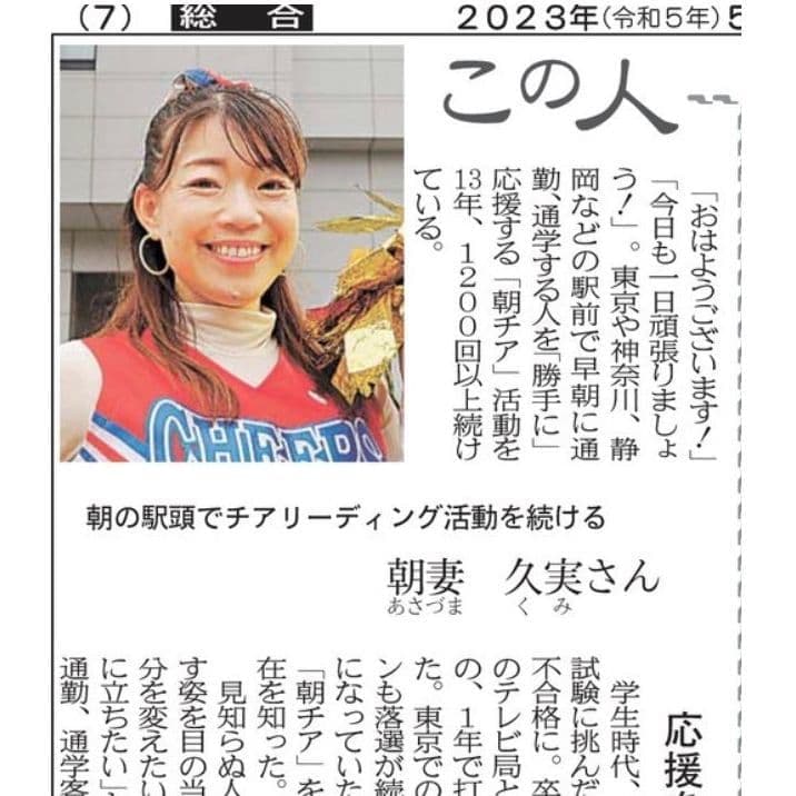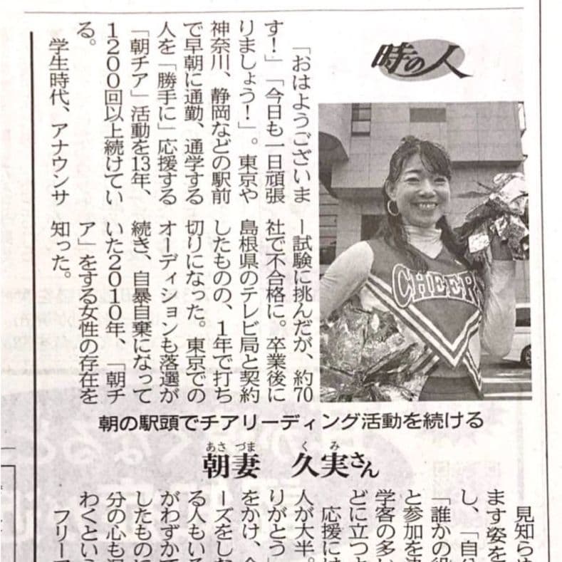 現在は、メンバーも増え、毎週木曜日や金曜日の朝に、新宿、新橋、池袋、桜木町などの駅前で道行く人たちを勝手に応援する「朝チア」の活動を続け、2022年で13年目を迎える。朝チア実施回数は1100回以上。